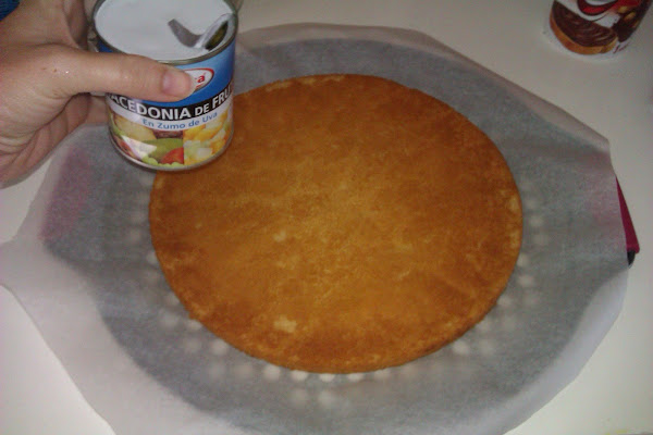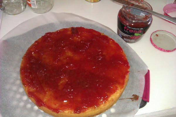 Luego continuamos con la segunda capa, que colocaremos una de bizcocho, lo mojamos con almíbar y untamos una capa de mermelada.