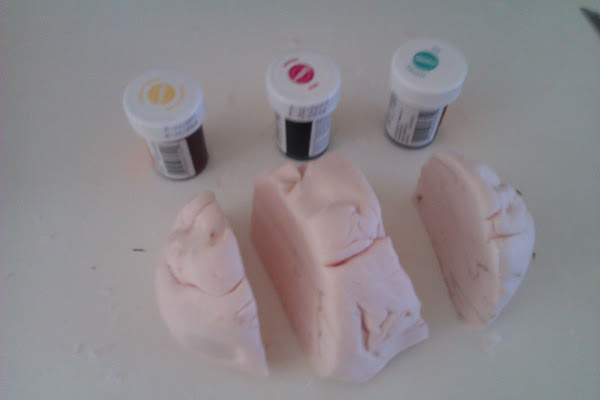 El trozo de fondant restante lo cortaremos en tantos trozos como colores vaya a tener nuestra tarta, para así mezclar cada uno con el colorante. En mi caso usé sólo dos colores.