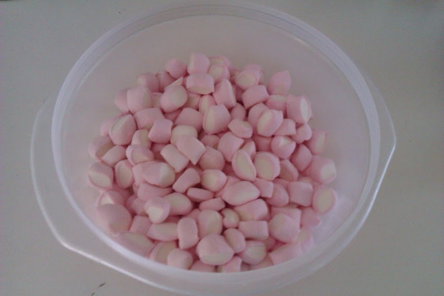 Comenzaremos derritiendo las nubes en el microondas. Añadimos al recipiente manteca para que no se peguen las nubes. Las cortamos en trozos pequeños y las introducimos 1 minuto.