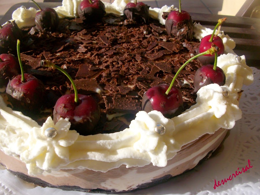 Hoy es mi cumpleaños.......46 añitos, casi nada.Lo celebramos ayer con la familia, y desde que estoy en el grupo del Desafío en la Cocina me he iniciado en el mundo de la repostería. Ayer hice esta tarta Selva Negra, después de algún que otro problemilla aquí os dejo el resultado.Tengo que mejorar muy mucho la presentación pero os puedo asegurar que estaba deliciosa. INGREDIENTES Para el bizcocho: ...