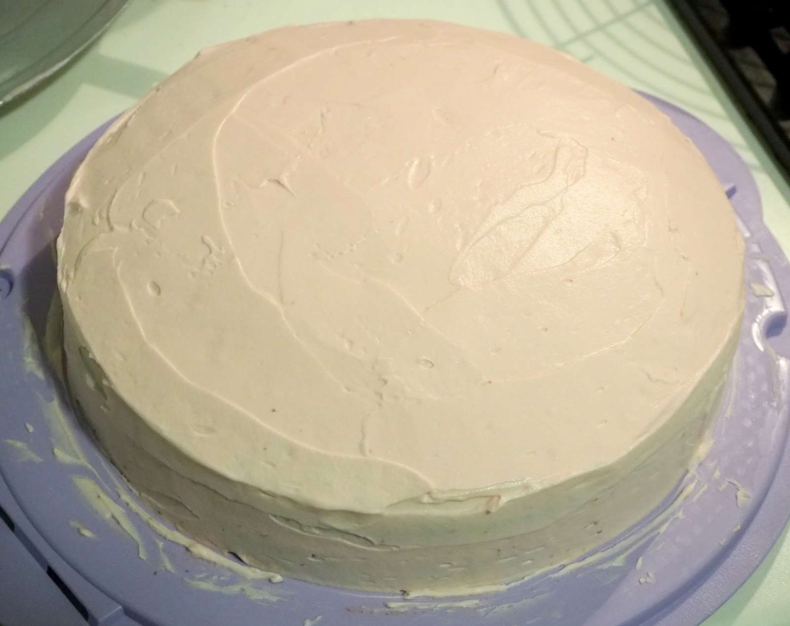 - Pasado un rato, sacamos la tarta de la nevera y procedemos a dar la segunda y definitiva capa de crema, que ya sí debe quedar tupida y lo más lisa posible. Al terminar volvemos a meter en la nevera.