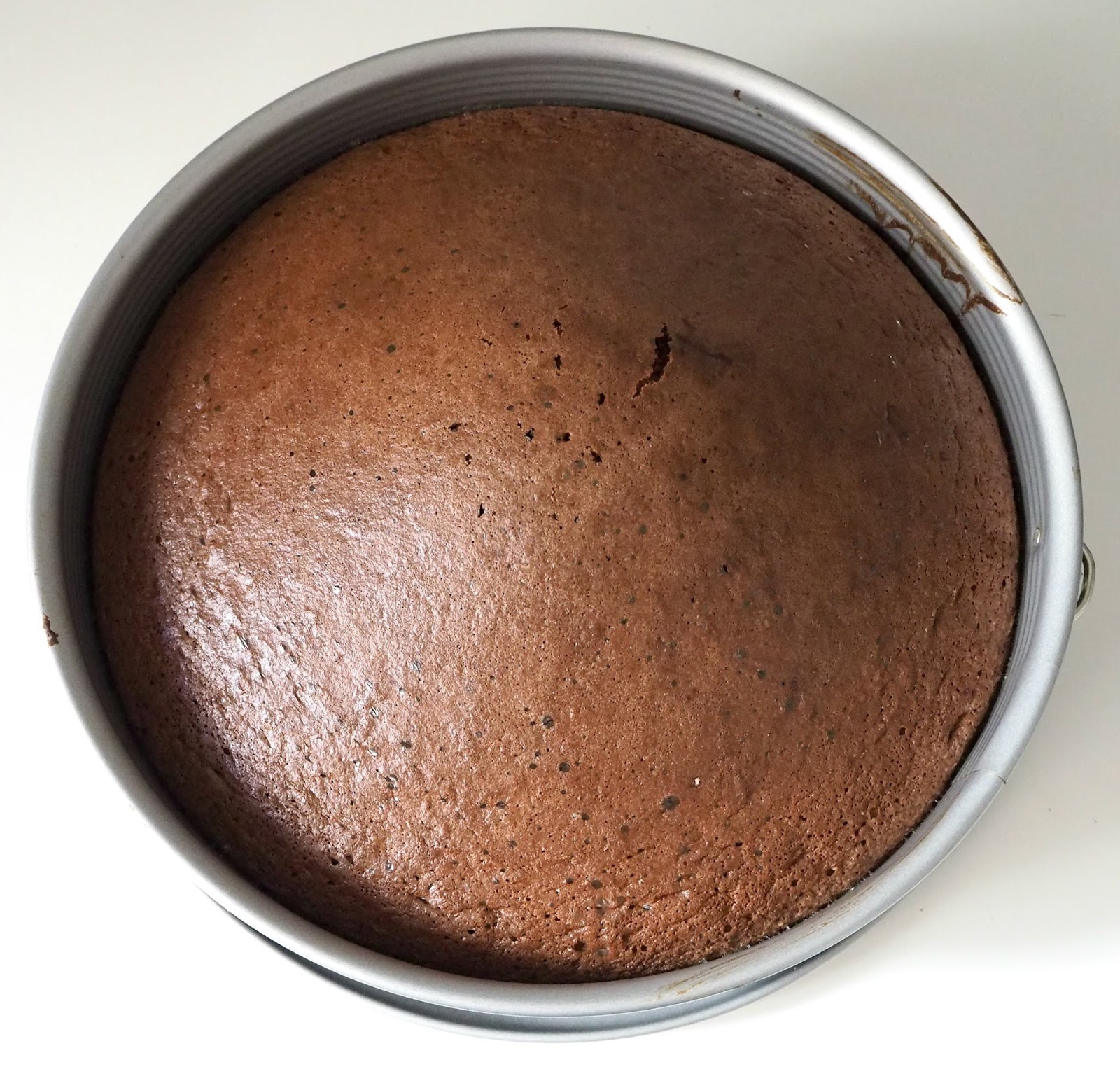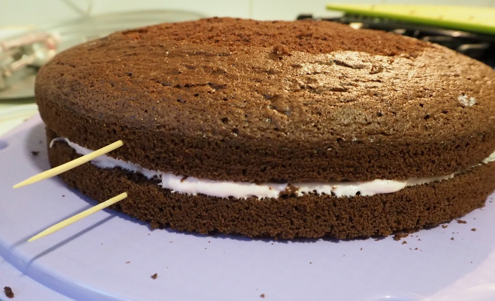 - Colocamos la otra pieza de bizcocho (si estuviera muy abombada podemos cortar un poco la punta), y repetimos la operación: almíbar y crema de chocolate.