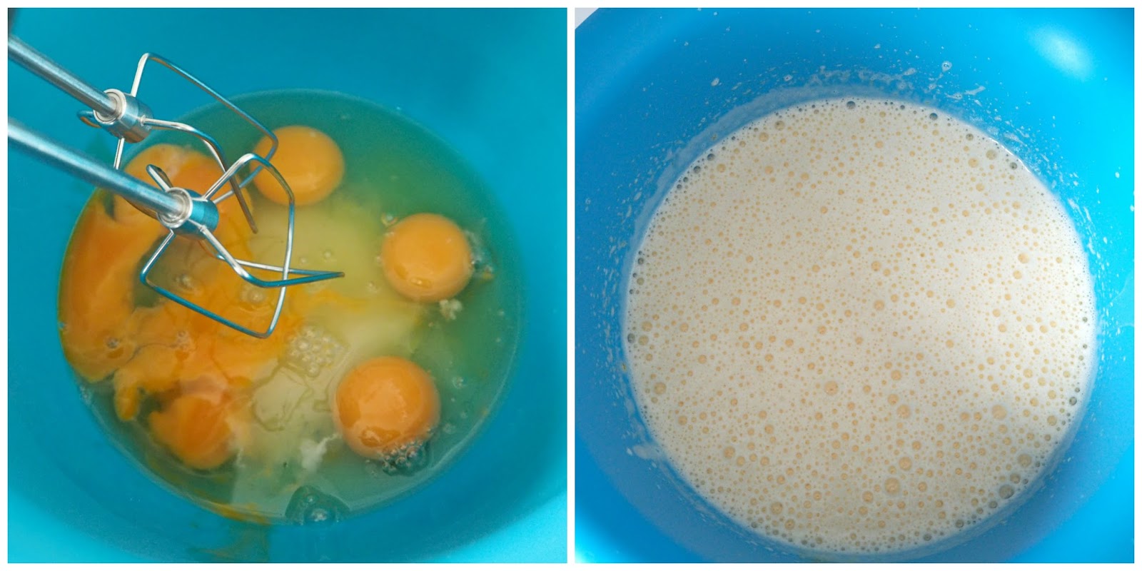 - Al día siguiente preparamos el resto de la tarta. Empezaremos por el bizcocho. Hacer un bizcocho genovés requiere cuidado para que salga bien. Juntamos el azúcar y los huevos en un bol y batimos con las varillas hasta obtener una mezcla blanquecina y que triplique el volumen inicial. Este paso es muy importante. Hay que batir muy bien.