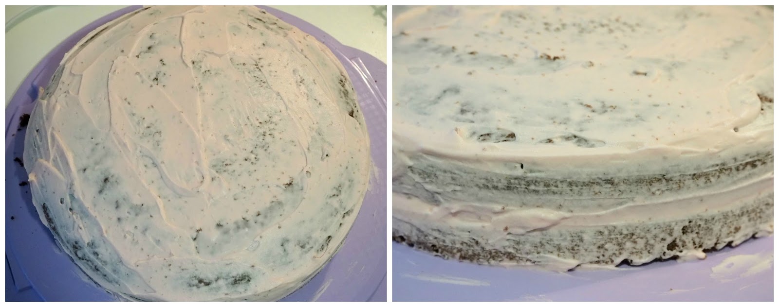 - Extendemos crema también por el borde de la tarta. No tiene que ser una capa muy gruesa. Esta capa lo que hacer es compactar y pegar las migas. Así al enfriar y cuando añadamos la siguiente capa las migas no se moverán de una lado a otro manchando el pastel. Después de esta primera capa, guardamos la tarta e l nevera para que se enfríe y endurezca un poco la crema de chocolate.