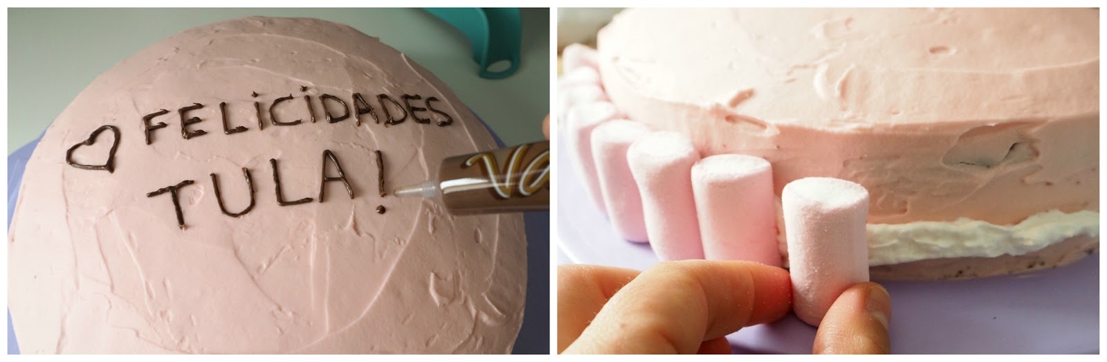 - La decoración la podemos poner en el último momento. Para ello o utilicé unas nubes de gominola que pegué por los laterales con un poco de nata montada (crema de leche). Por encima escribí con un bolígrafo de chocolate la felicitación a mi sobrina y espolvoreé estrellitas de azúcar. Después a la nevera hasta el momento de la fiesta.