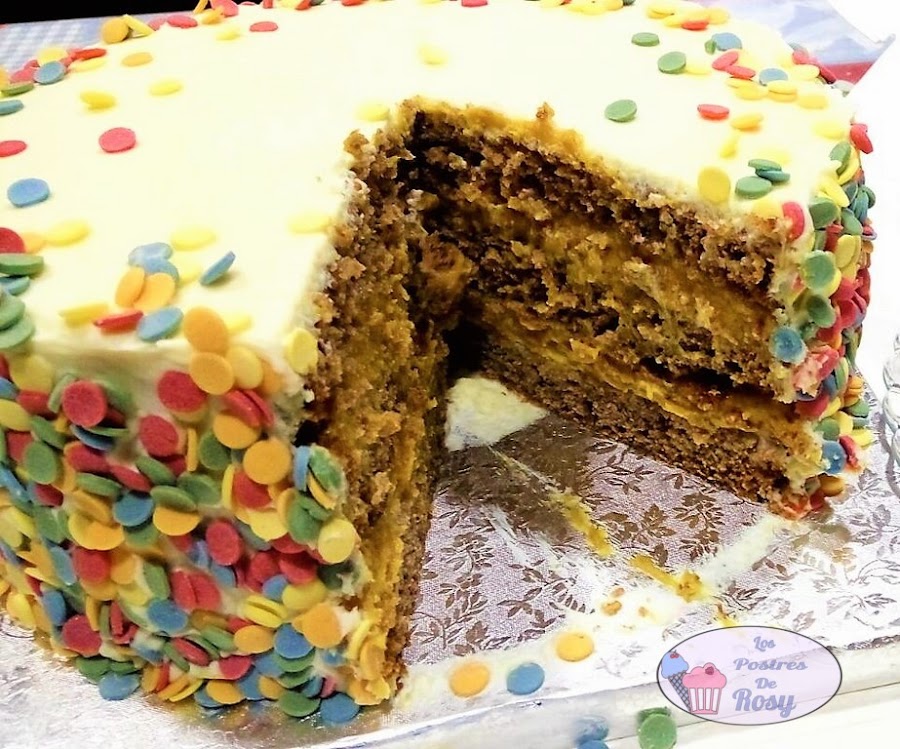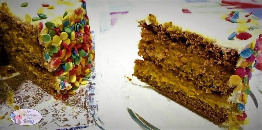 La verdad es que quedó de 10, esponjosa, jugosita por dentro, sin necesidad de almibarar ni emborrachar, con un extra de sabor gracias a la crema de plátano, y muy original por la decoración carnavalera, ah, y lo más importante, sobre todo para mí, jejejej, y es que es SIN LACTOSA. Está mal que yo lo diga, pero quedó IMPRESIONANTE, jejeje.