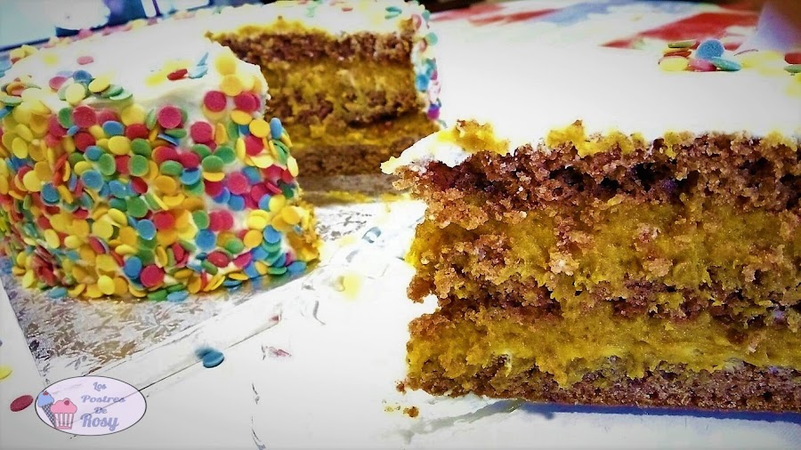 Para hacer esta tarta, primero elaboré un BIZCOCHO DE PASAS Y TÉ (click aquí para ver receta) hecha en un molde de 18 cm. y la corté en tres pisos para poder rellenarla sin que se quedara ni seca ni pesada. La rellené con una CREMA PASTELERA (click aquí para ver receta) a la que le dí sabor a plátano agregando dos plátanos maduros bien blanditos. La cubrí con GLASEADO DE CHOCOLATE (click aquí para ver la receta) que elaboré con chocolate blanco, un poco de nata (crema de leche) sin lactosa montada y sin licor. Y, finalmente, la decoré con un topping de CONFETI DE AZÚCAR.