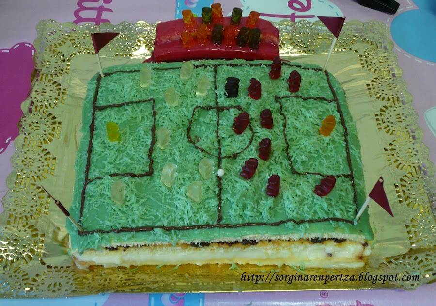 Lleva tres planchas de bizcocho genovés, una capa rellena de crema pastelera y la otra de crema de chocolate. El cesped es chocolate blanco derretido con nata (crema de leche), al que he coloreado con colorante verde y las gradas con colorante rojo. Los banderines son al más puro estilo scrapero.