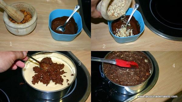 Machacamos las almendras y a golpe de microhondas de 20 segundos vamos calentando el chocolate