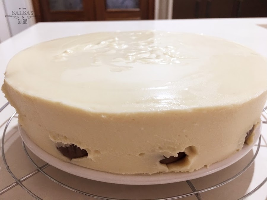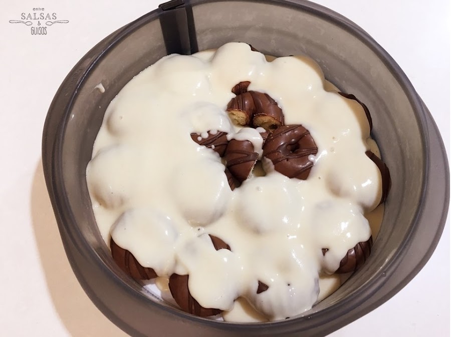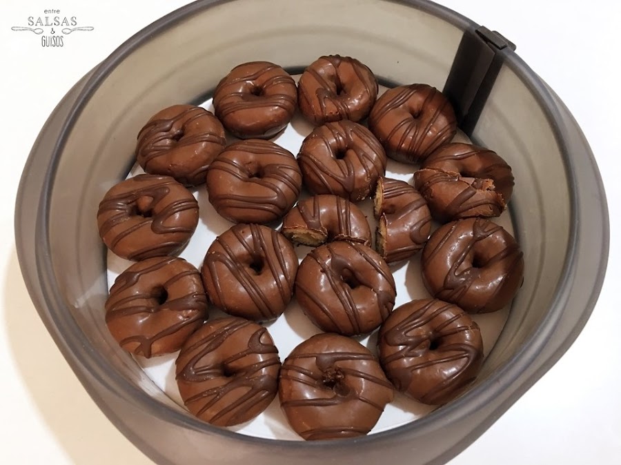 Una vez hecha la crema vierte sobre la base de la tarta y espera a que enfrie. Guárdala en el frigo, mejor de un dia para otro. (Para evitar que floten los donetes, pon un poco de crema y pon el molde en el congelador durante unos minutos para que cuaje rapidamente, después ya puedes poner con cuidado el resto de la crema).