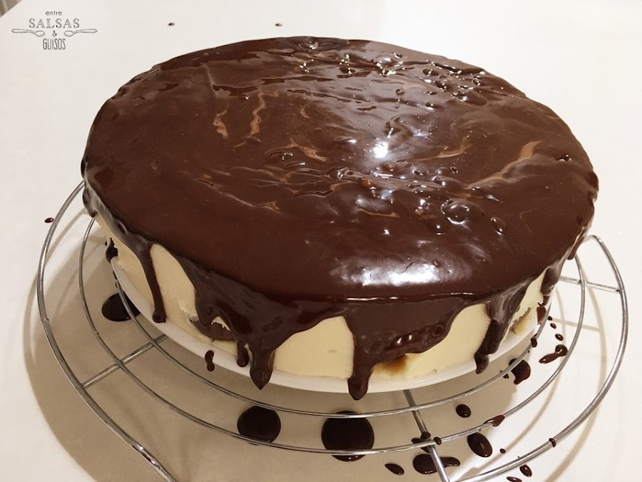 Desmolda la tarta y vierte la cobertura de chocola sobre ella. Extiéndela ligeramente y decora a tu gusto. Vuelve a poner la tarta en el frigo para que termine de endurecer el chocolate.