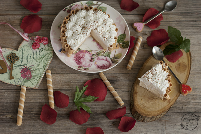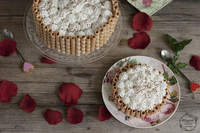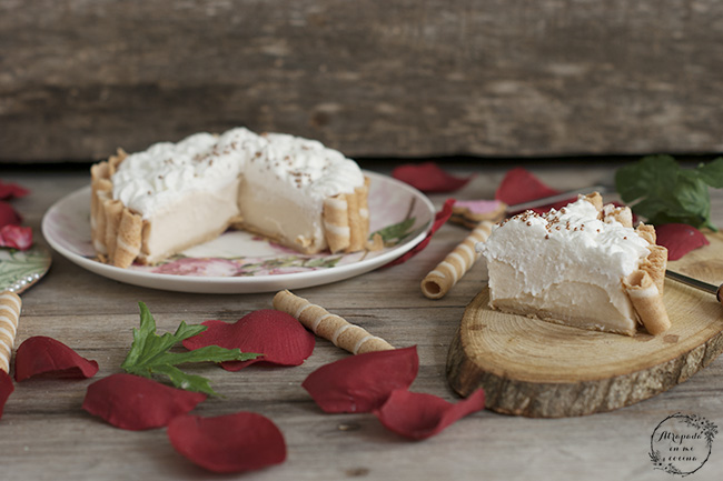 Sacamos una vez cuajada y decoramos con los barquillos. Montamos la nata (crema de leche) junto con 2 cucharadas de azúcar glass y decoramos la parte superior de la tarta. Espolvoreamos con perlitas de azúcar, en mi caso color bronce (aunque ésto es opcional).
