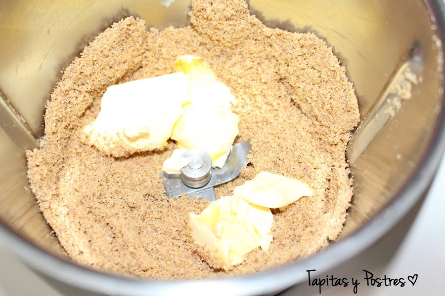 Con una batidora o picadora trituramos las galletas y el donut hasta hacerlos migas. Añadimos la mantequilla y mezclamos hasta obtener una pasta que pondremos en el fondo de un molde desmoldable. El mío es de 26 cm. Dejamos en la nevera un rato.