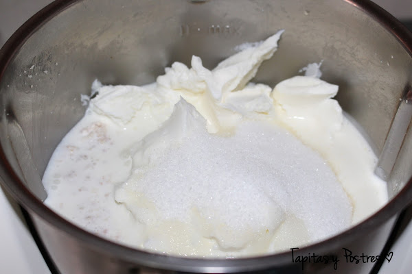 Agregamos el queso, la nata (crema de leche) y la leche y mezclamos bien.