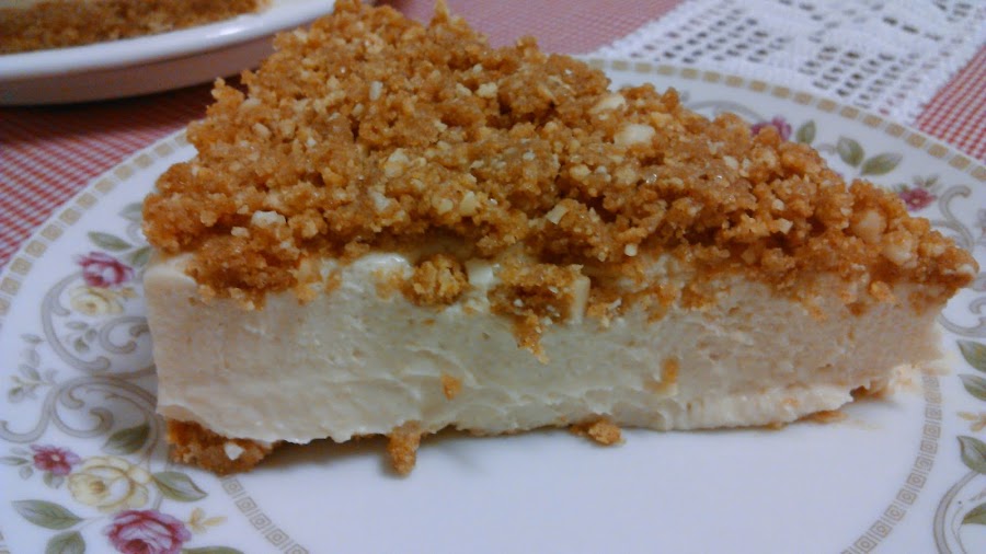 Tiene un delicado sabor a donut que resulta delicioso y esa crumble con galletas y frutos secos desmigada por encima está riquísima!!!