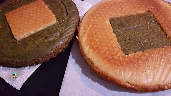 Tarta de dos colores, elaboración: 1.- Preparamos el bizcocho de té verde: En un bol ponemos los huevos, la mantequilla a temperatura ambiente y el azúcar. Lo batimos bien con la varillas eléctricas durante 8 minutos hasta que doble su volumen. Añadimos la cerveza, mezclamos bien con una varilla de mano. Incorporamos la harina tamizada, el té verde y la levadura. Mezclamos bien hasta conseguir una masa homogénea.