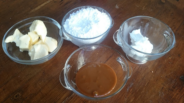 Batimos la mantequilla con el azúcar glass durante 10 minutos, hasta que coja consistencia de crema, añadimos el queso crema, y el dulce de leche.