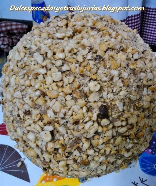 Mientras desmoldamos nuestro bombón y lo cubrimos totalmente con las avellanas picadas. Esto es un poco entretenido pero nos va a dar el tiempo justo para que se enfríe la cobertura. Ya va teniendo buen aspecto ¿no?