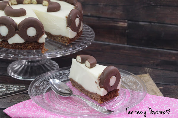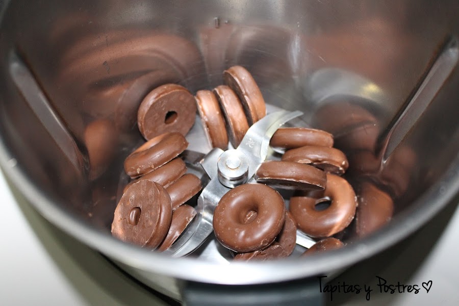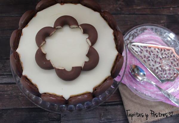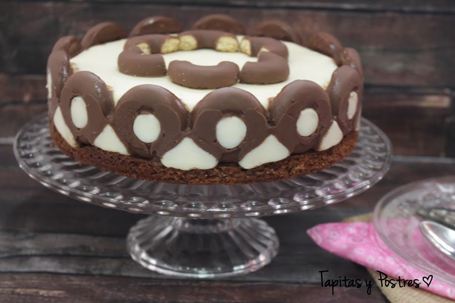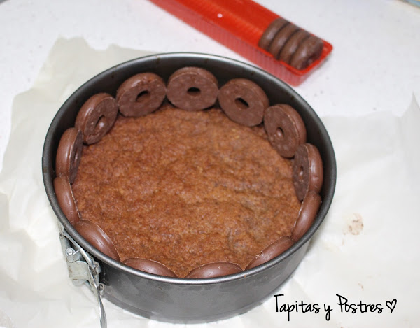 Ahora os cuento, al estar rodeada de los filipinos, que son a fin de cuentas, aros de chocolate, esto nos va a marcar el corte de cada ración, por lo que es una tarta que cunde mucho. Los filipinos se mantienen crujientes, asi que es un bocado exquisito. Otra cosa, estas cantidades son para un molde de 18-20 cm, la crema queda justa, para que los filipinos sobresalgan y haga ese dibujo tan bonito a modo de arcos. Si queréis una tarta más grande deberemos doblar las cantidades, pero los tiempos de cocinado serán los mismos.