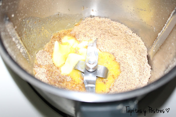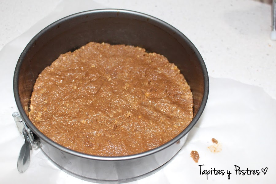 Comenzamos haciendo la base, trituramos los filipinos en la thermomix o con una batidora 5 segundos a velocidad 7. Añadimos la mantequilla, que tiene que estar blanda y mezclamos 20 segundos a velocidad 4. Ponemos esta mezcla en el fondo de un molde desmoldable y aplastamos bien. Horneamos 10 minutos a 180º. Dejamos enfriar.