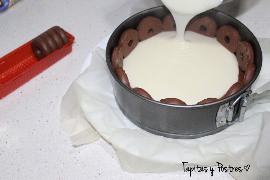 Ahora vamos con el montaje, hay que ser rápidos, por lo que antes de que la crema del relleno esté lista tenemos que tener colocados los filipinos sobre la base de galletas y alrededor de todo el molde. La crema va a salir muy caliente y espesa, por lo que la vertemos en el molde con cuidado de que no nos tumbe ningún filipino de los que hemos puesto alrededor. Como sale muy caliente, el chocolate de los filipinos empezará a derretirse, así que para que no nos fastidie la tarta, en cuanto hayamos vertido la crema la metemos en la nevera.
