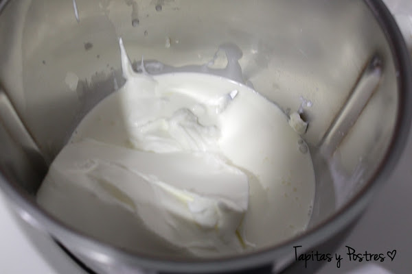 Nos ponemos con la crema, en el vaso de la thermomix ponemos todos los ingredientes (nata (crema de leche), queso, yogur, azucar y sobres de cuajada), y mezclamos primero 20 segundos a velocidad 3 y luego calentamos 7 minutos, a 100º y velocidad 4. Podemos hacerlo en un cazo grande, calentando a fuego suave, hasta que vemos que empieza a espesar.