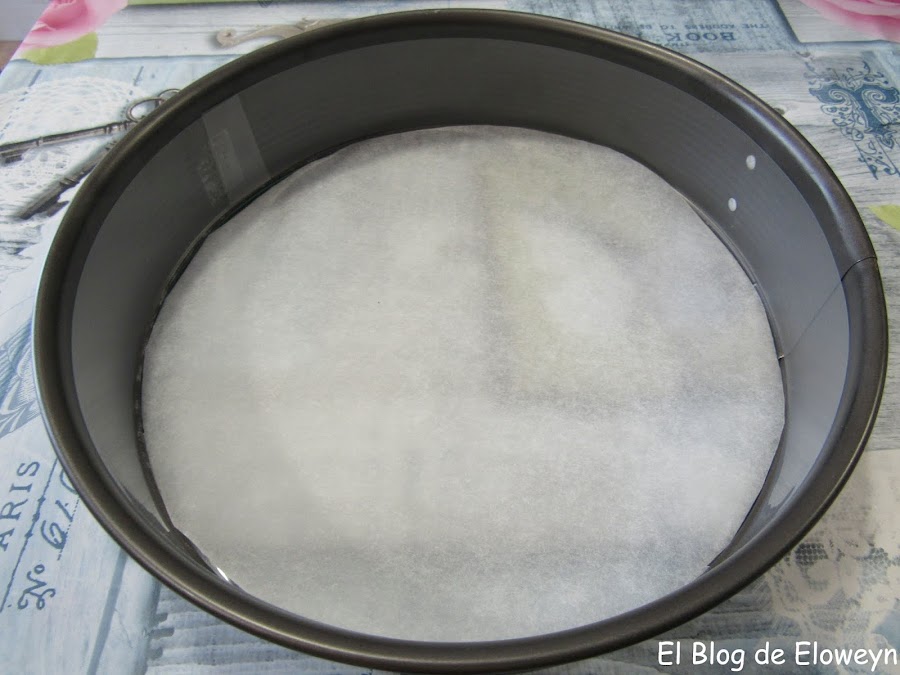Seguimos con el molde. El molde tiene que ser desmontable. Yo le pongo papel de hornear en la base, ya que de esta forma la base no se pega al molde y es más fácil sacar el trozo de tarta que acabas de cortar.