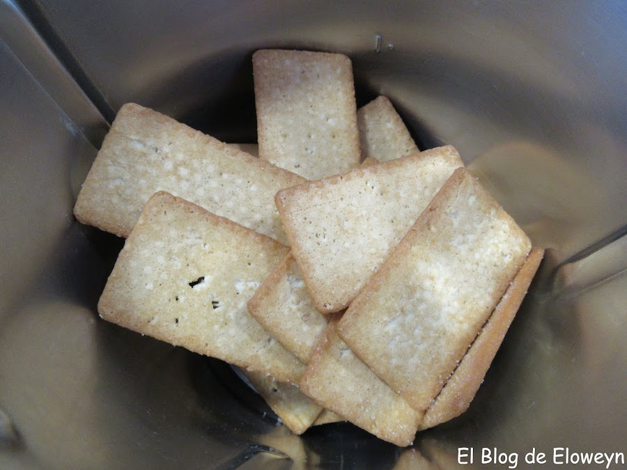 Comenzamos con la base. Podemos utilizar una picadora o la Thermomix para hacerla. No importa qué uséis. Ponemos los 100 gramos de galletas en el vaso de la picadora o de la Thermomix.