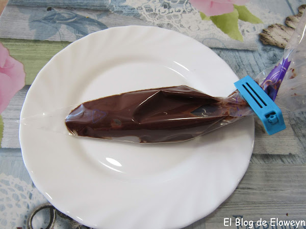 A continuación, cortamos la puntita de la manga pastelera. El corte no ha de ser demasiado grande. Ha de ser lo más pequeño posible. Se trata de que salga un hilillo de chocolate, no un chorro. Más vae que nos quedemos cortos al cortar, que no que nos pasemos. Podemos hacer la prueba para ver si sale bien en un plato, apretando un poco la manga pastelera.