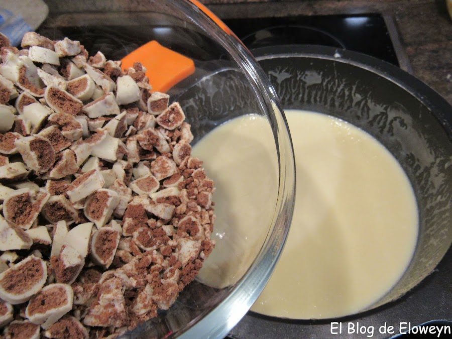 Cuando comience a hervir, paramos el fuego y vertemos los filipinos de chocolate blanco que habíamos cortado en trocitos.