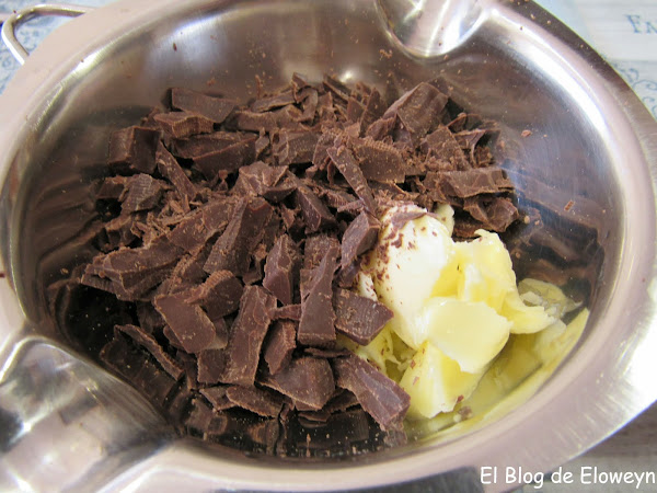 Para los que no sepan qué es el baño María, se trata de poner dos cazos al fuego. Un cazo más pequeño sobre otro más grande. En el cazo más grande, que va debajo, se pone agua y en el cazo más pequeño, que va arriba, ponemos lo que se quiere calentar en el baño María. En nuestro caso, chocolate y mantequilla. Tratándose de chocolate (que irá en el cazo más pequeño, que estará encima) tenemos que tener mucho cuidado con el agua. El agua nunca debe de tocar el chocolate. Si cae una sola gota, el chocolate se estropeará y quedará grumoso y reseco.