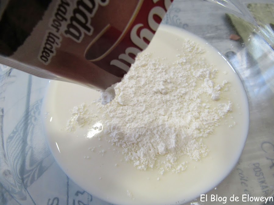 A continuación seguimos con la capa de chocolate con leche. Primero de todo ponemos los 200 ml. de leche en un recipiente y le añadimos el sobre de cuajada. Removemos con una cuchara hasta que se haya disuelto bien.