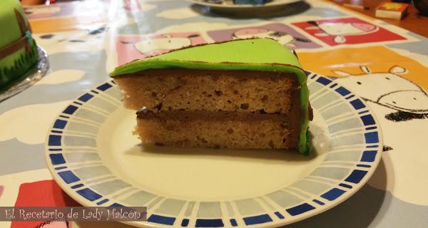 El bizcocho quedó muy jugoso y suave. Quise hacerlo un poquito diferente del tradicional y le añadí mermelada de moras ¡qué delicia! Y como no quería que quedara muy dulce, rebajé la cantidad de azúcar para compensar el dulzor del fondant. Así que si queréis preparar esta tarta sin la decoración, os recomendaría que añadieseis un poco más de azúcar y, como siempre, la mermelada que más os guste.