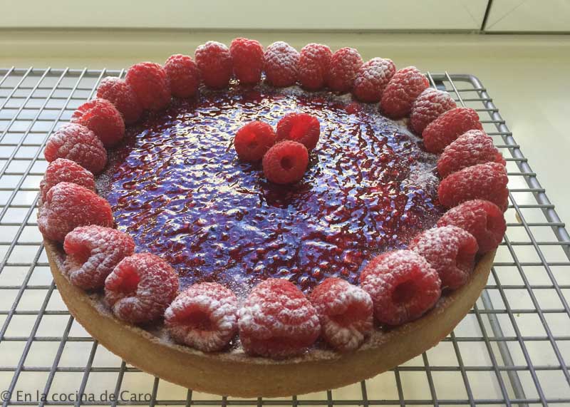 Ponemos las frambuesas en circulo alrededor de la tarta y espolvoreamos con azúcar glas.