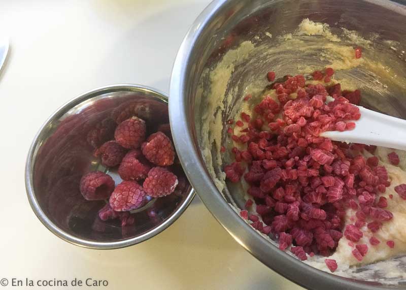 Cuando tenemos esta preparación lista le agregamos 125g de frambuesas congeladas, la ventaja de ser congeladas es que nos viene mejor para romper y mezclar con la crema de almendra.