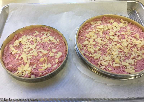 Cuando está fria le ponemos una capa de frambuesa pepins o la confitura de frambuesas.