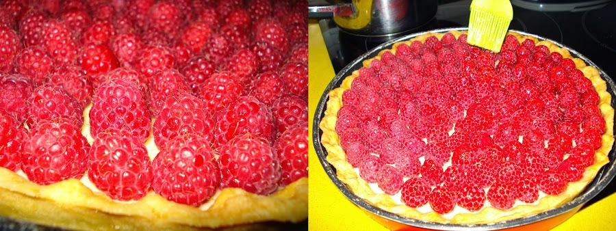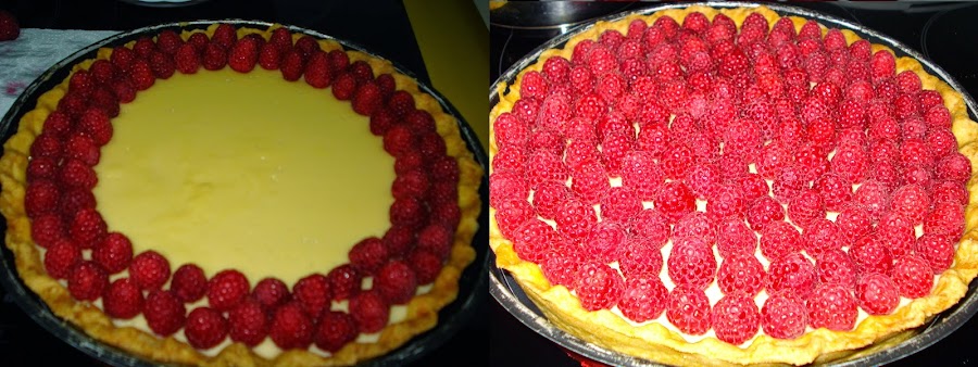 Disponemos las frambuesas sobre la crema pastelera formando círculos desde fuera hacia dentro.