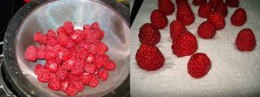 Lavamos las frambuesas, las escurrimos y las colocamos sobre papel absorbente con el agujero hacia abajo para que expulse el agua.
