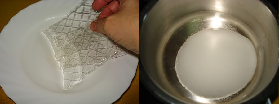 Mientras que la masa quebrada está en el horno preparamos la gelatina. Ponemos a hidratar en un plato con agua fría 3 hojas de gelatina durante 5 minutos.