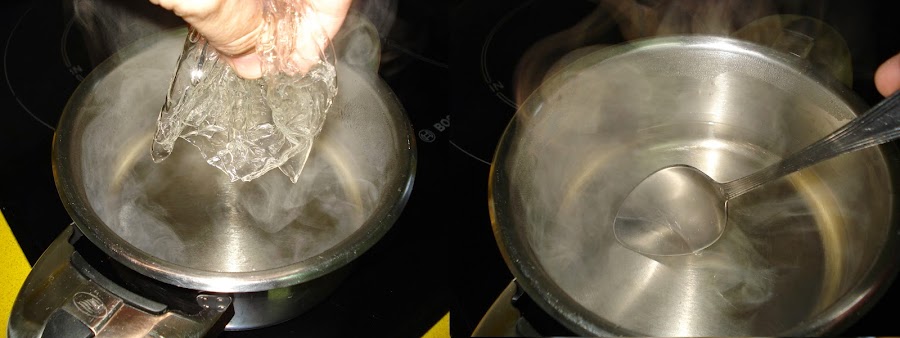 En un cazo calentamos un vaso de agua con dos cucharadas de azúcar y cuando rompa a hervir agregamos las hojas de gelatina hidratadas y escurridas, removemos para que se disuelva, apartamos y vertemos en un cuenco donde dejaremos enfriar.