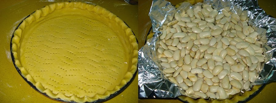 Pinchamos con un tenedor la masa quebrada, le ponemos encima papel de aluminio, colocamos legumbres sobre el papel de aluminio y metemos al horno a 180º hasta que estén dorados los bordes, entonces le quitamos las legumbres y el papel de aluminio y dejamos que se dore la base un poco más.