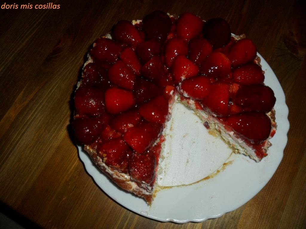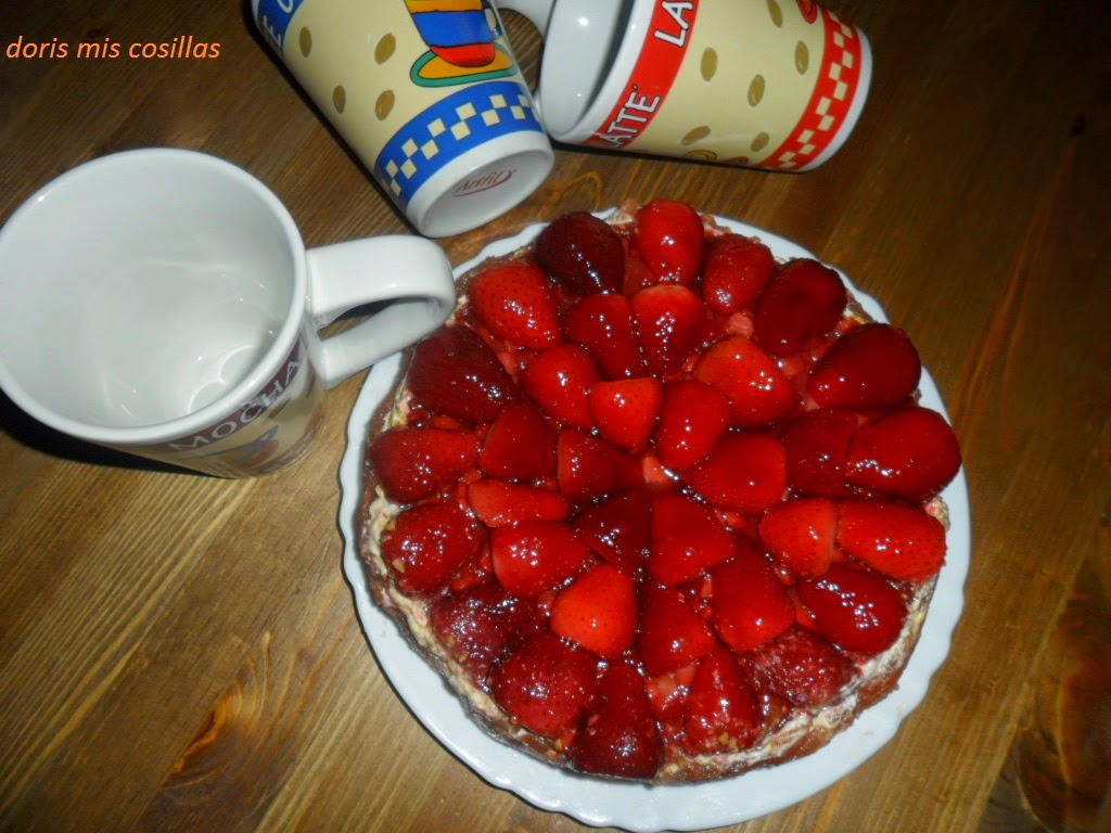 Por último, damos brillo y sabor a las fresas batimos una cucharada sopera de mermelada de fresa disuelta en un poco de agua caliente y listo. Deliciosa y muy cremosa.