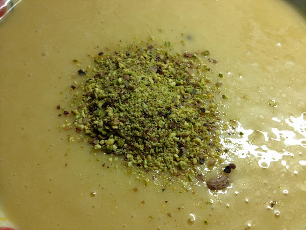 3.- Trituramos los pistachos, las semillas de cardomomo y la estrella de anís. Los añadimos a la masa. Una vez este todo bien unido, vertemos la mezcla en un molde bien engrasado con la margarina y enharinado, para que no se pegue la tarta.