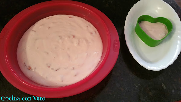 4/ Pasamos la mezcla al molde pequeño con ayuda de una espátula de silicona y si sobra podemos pasar un poco al molde de corazón para decorar luego más adelante la tarta por encima dejándolo en un recipiente a parte. Lo pasamos al congelador menos el corazón que va a la nevera para que no quede muy congelado.