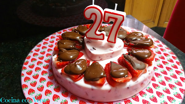 Una vez desmoldado le ponemos a modo decorativo las fresas laminadas que reservamos por encima y el corazón en medio de la tarta.