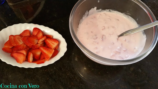 - 5 Fresas grandes o 10 pequeñas quitando los tallos verdes y cortadas en trocitos pequeños.