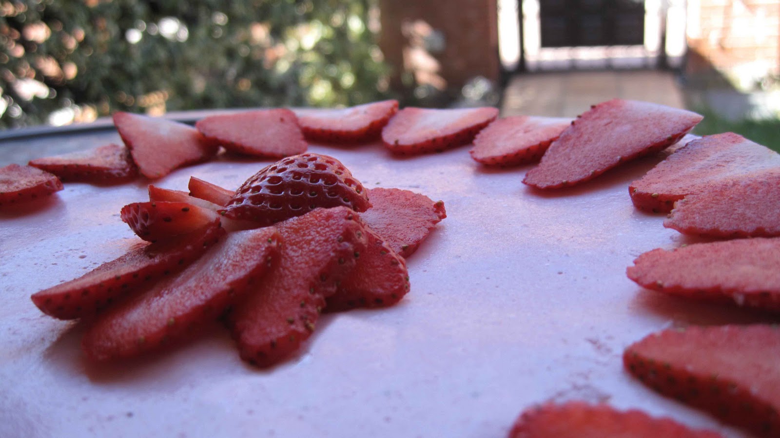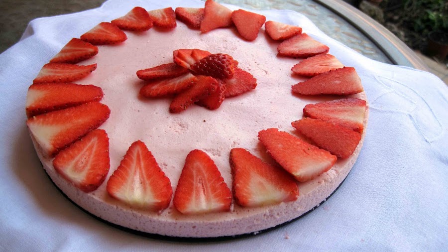 Lo vertemos en un molde desmontable y lo dejamos enfriar hasta que cuaje.Desmoldamos y lo decoramos con láminas de fresones que habíamos reservado.