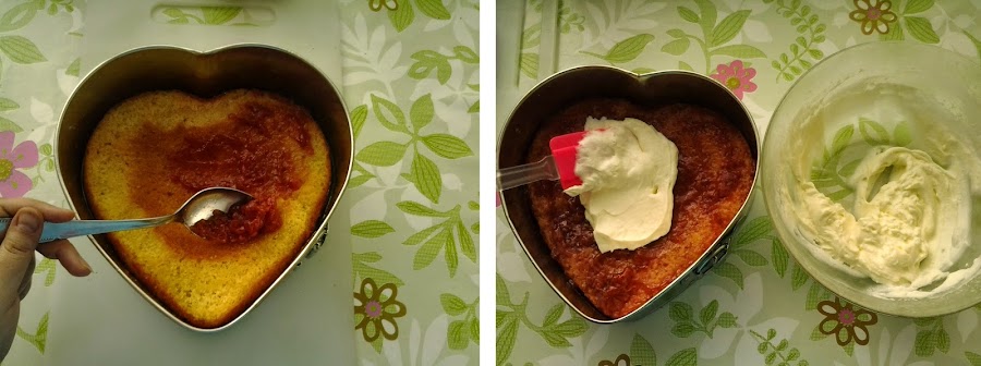 Ahora, pon una capa de mermelada de fresa. Deja enfriar por completo en la nevera una hora como mínimo.