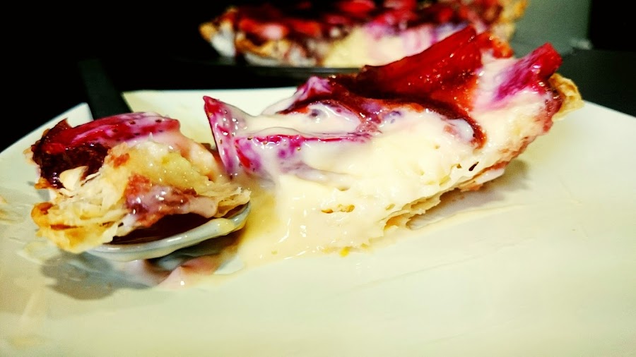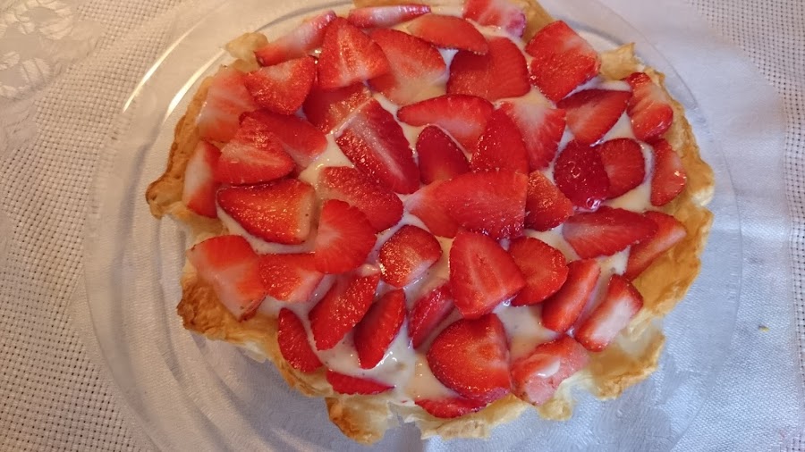 Pon la crema sobre el hojaldre ya horneado y cubre con las fresas partidas.