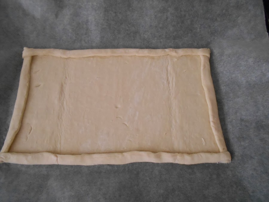 Una vez la tengamos lista cogemos la lámina de hojaldre y la extendemos en una bandeja de horno, en la que previamente habremos puesto papel de hornear.